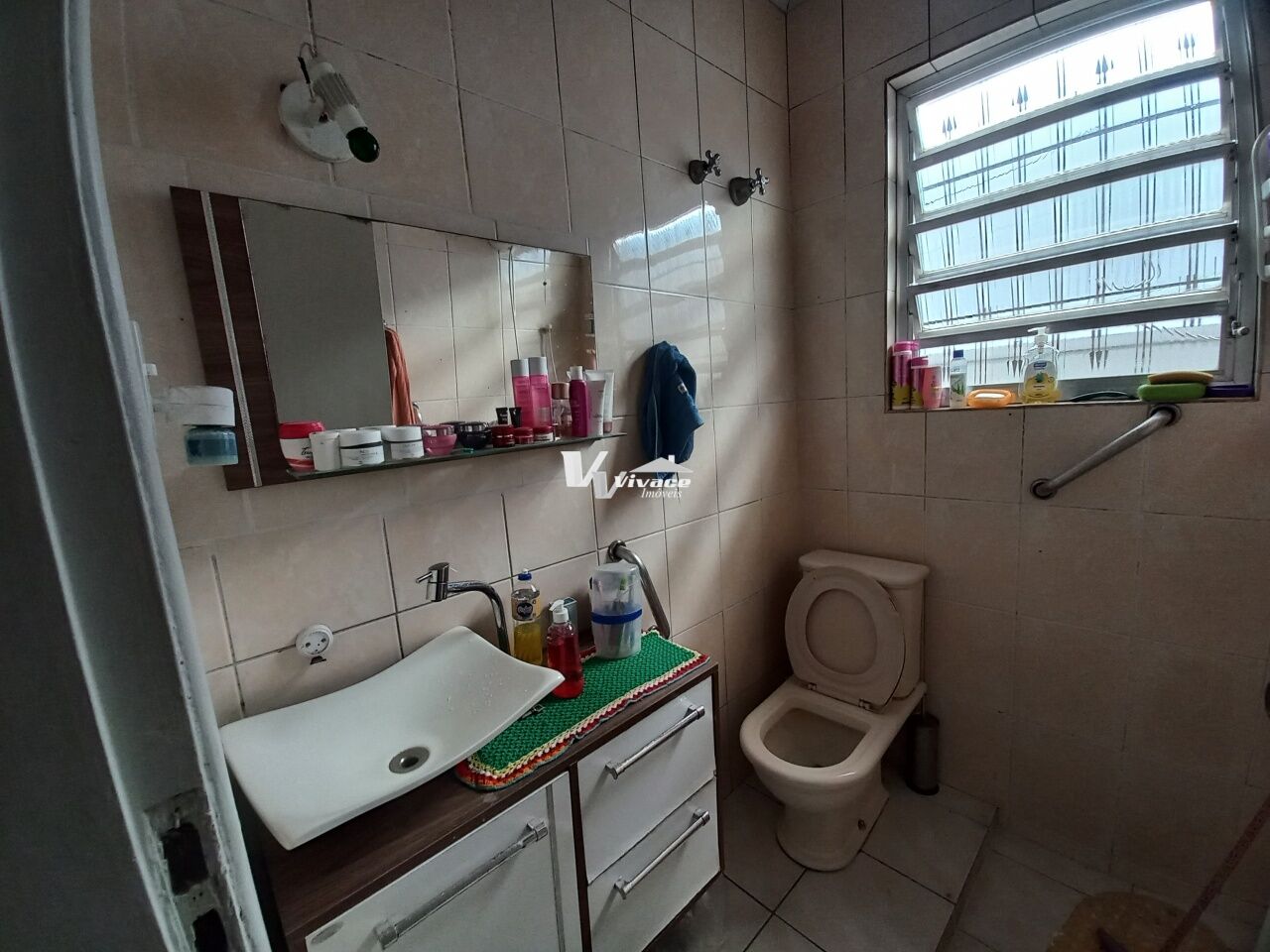 - Banheiro Social equipado com box de vidro, espelho grande e gabinete na pia;
