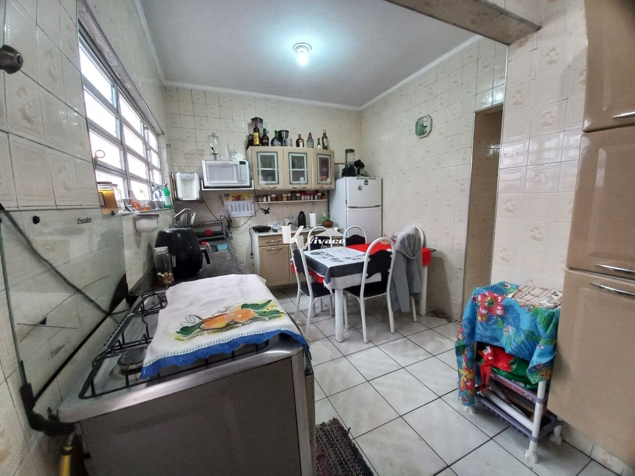 - Cozinha arejada com azulejos brancos, com coifa embutida e pia extensa;