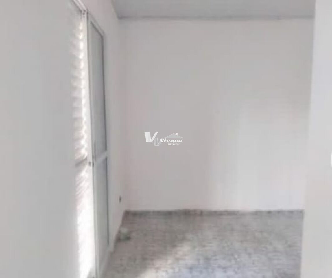 - Sala integrada à cozinha, com porcelanato branco.
